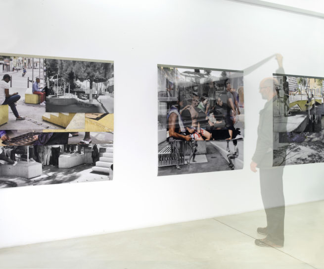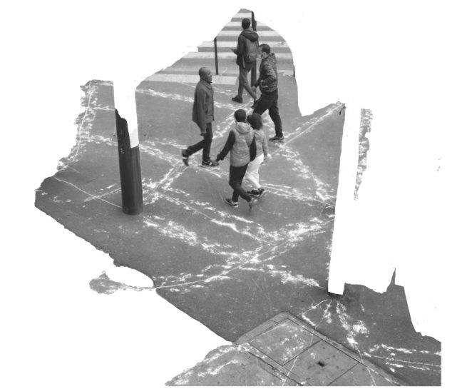C’est aussi la volonté de ne pas avoir un point de vue unique et d’échafauder plutôt une matière polyphonique : La prise de vue photographique avec plusieurs appareils permet de percevoir la diversité des choses et des corps de la rue et de superposer des visions singulières de la ville. Les enregistrements sonores et les repérages des signes urbains captent les traces de vie à travers les voix, les langages divers, les langues, les sonorités qui habitent les lieux. Les dessins empreintes ou lignes préfigurent de cartographies.
