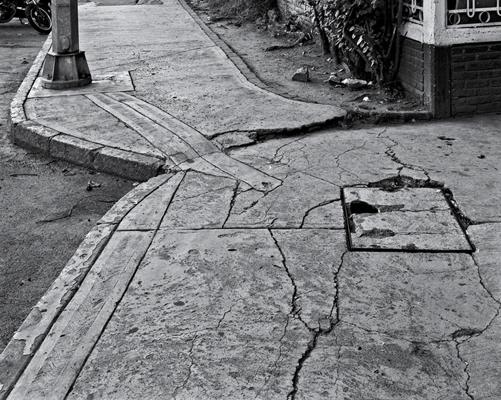 Comme la peau, le trottoir a des cicatrices. L’empreinte est la preuve la plus évidente du passage de la vie, la cicatrice, l’aboutissement d’une expérience, d’une fracture. Bien sûr, il s’agit dans les deux cas de traces de battements, de lacérations, de coupures, d’écorchures ou de brûlures. Celles-ci constituent une sorte d’instantanéité prolongée, déclenchant parfois une violente prise de conscience.